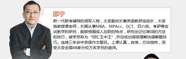 太奇近二十年的行业领导地位,是你成功的保险选择!太奇被称为管理类联考的“黄埔军校”,与各院校经管学院建立了深厚的人脉关系,这种关系是考生了解报考动态、掌握院校信息、复试优先占位的宝贵人脉资源。